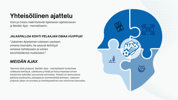 Pelaajat aloittavat harrastamisen entistä nuorempana, joten lasten valmennuksessa pedagogiset taidot ja kyky luoda positiivinen ilmapiiri ovat merkittävässä roolissa. Seuran toiminnassa näkyvät liikunnalliset ja kasvatukselliset otteet ja arvot. Ajaxilaisten vanhempien roolia aktivoidaan tukemaan heidän lapsensa liikunta- ja urheiluharrastusta.